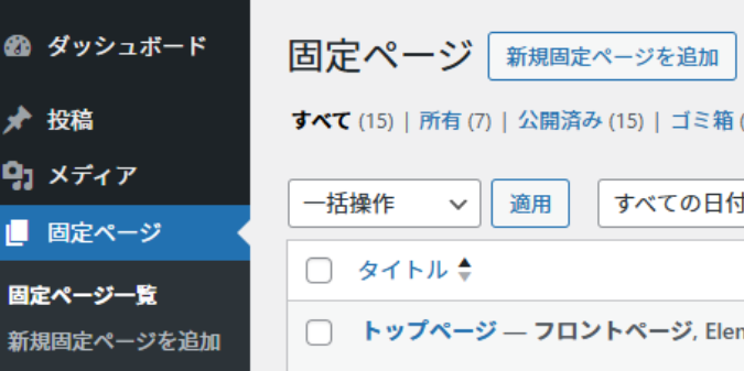 管理画面にログイン後、画面左に表示されるメニューから「固定ページ」をクリックします。