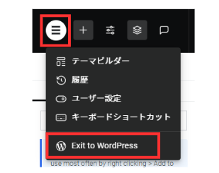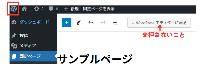 画面の上部の「← WordPressエディターに戻る」というグレーのボタンはクリックしないでください。操作を進めるとページが壊れます。